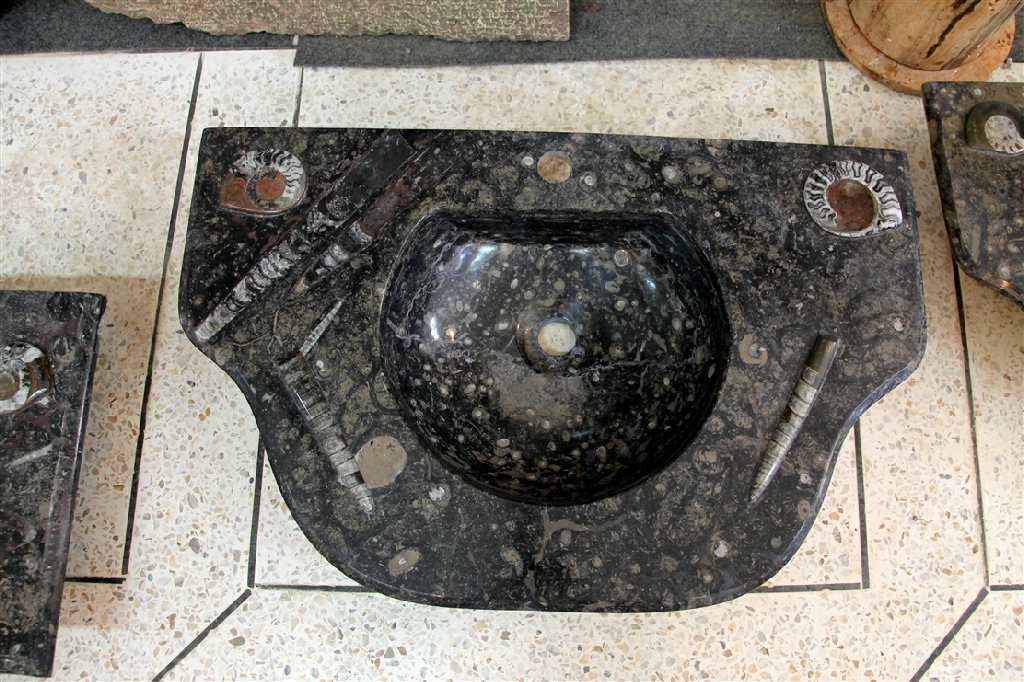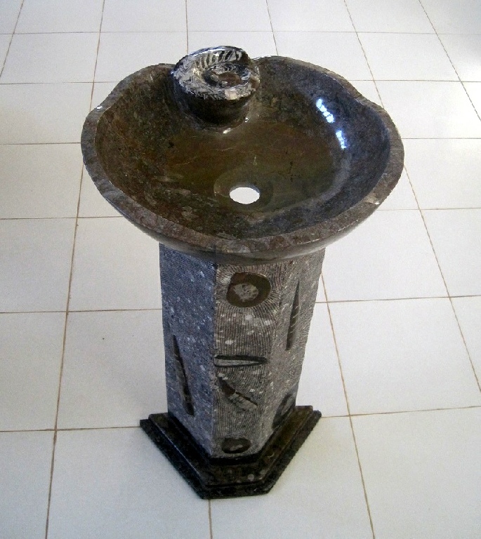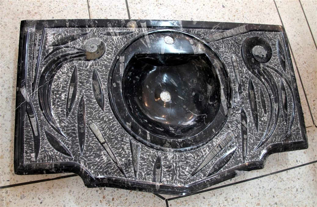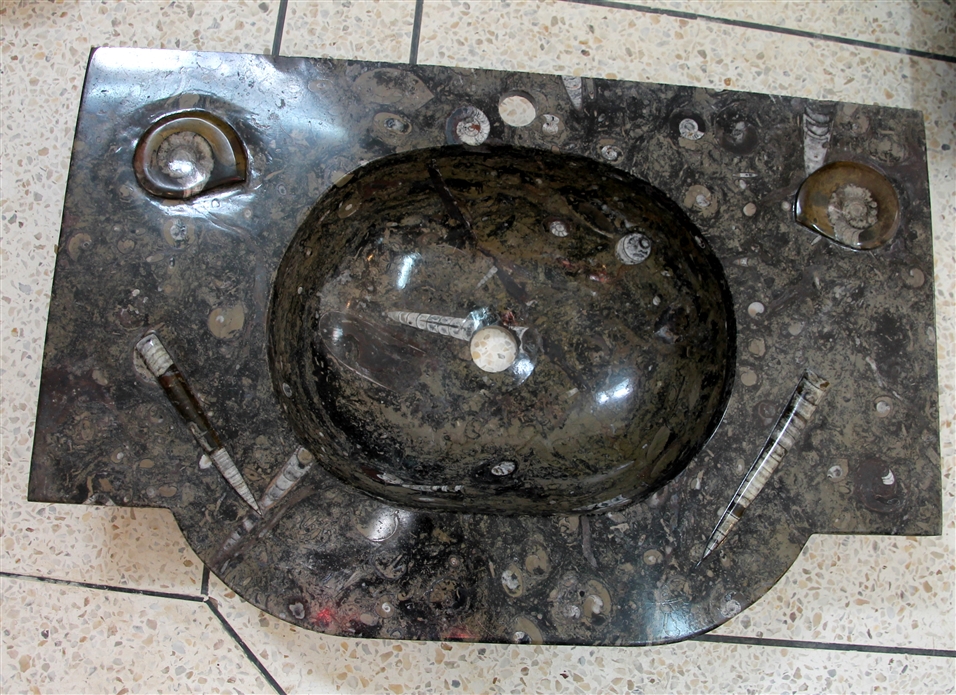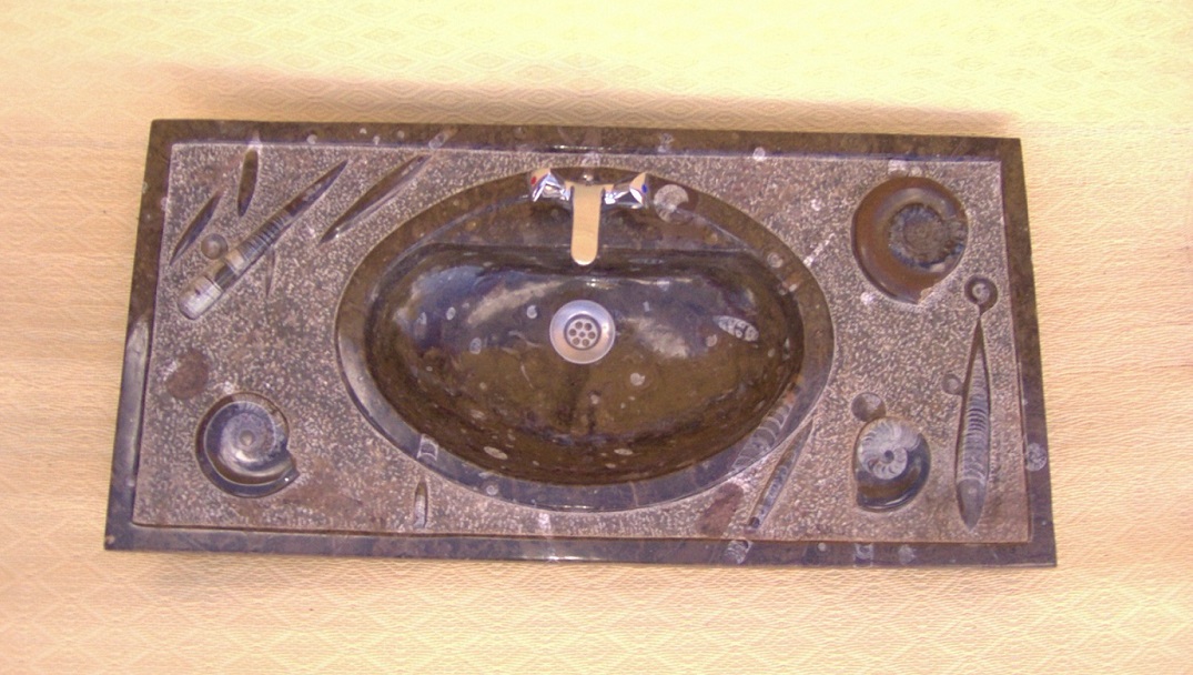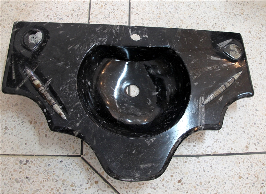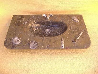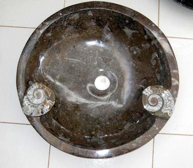Le travail de la nature peut être vu dans ces merveilleux éviers en pierre. Les ammonites et orthocères fossiles vieux de 345 millions d'années dans chaque évier créent une beauté naturelle époustouflante qui ajoutera à votre salle de bain. Il s'agit d'une trouvaille « unique en son genre » qui rehaussera la décoration de votre maison.